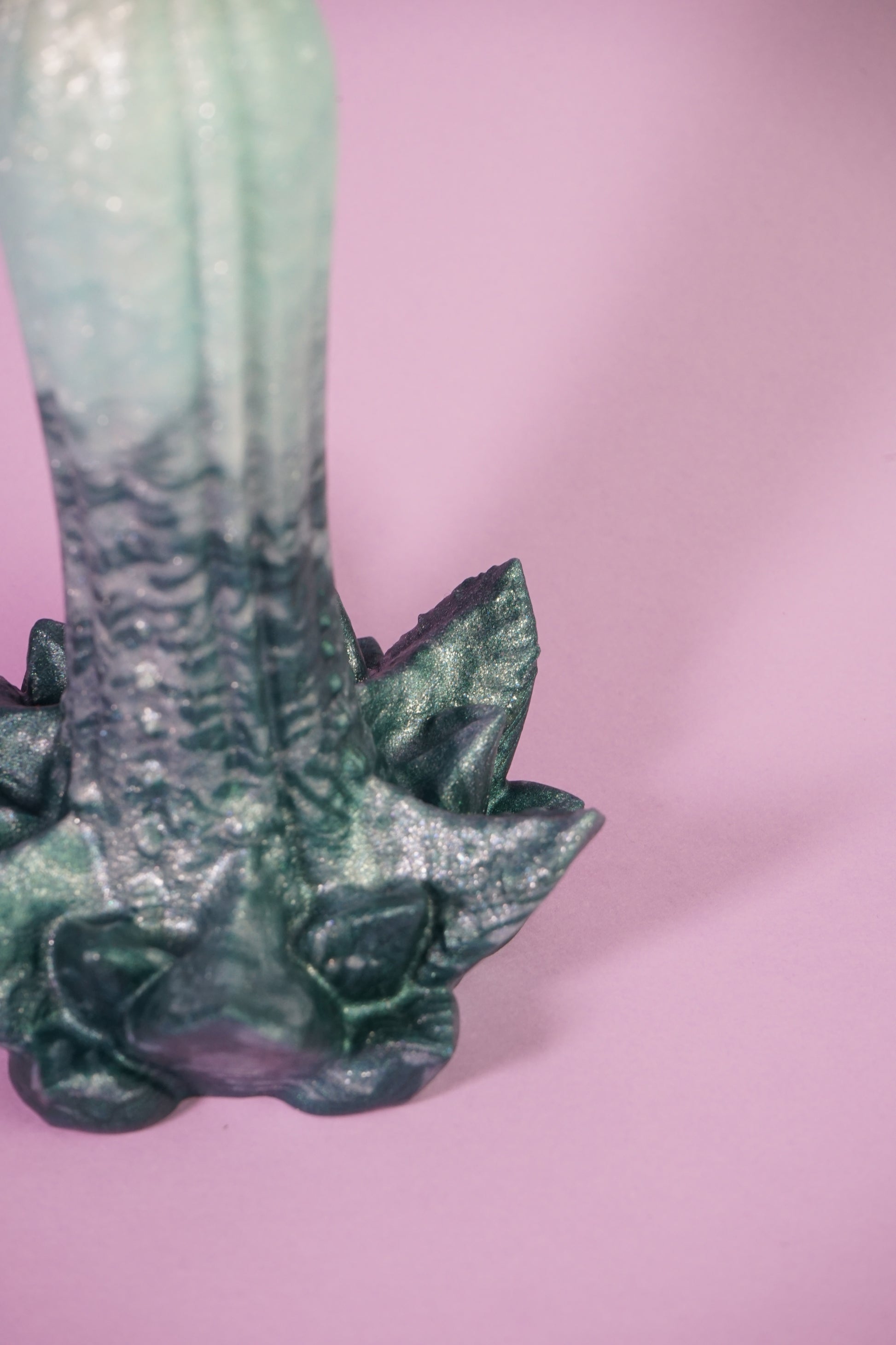 Sa base feuillue, son corps texturé et ses reliefs organiques évoquent une plante mystique prête à éclore sous vos doigts.